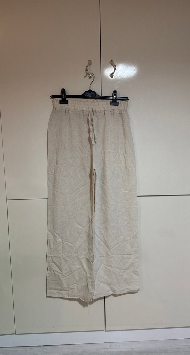 Bej keten bol kesim pantolon. Minimalist ve bohem tarzıyla rahat, günlük şıklık sunar. İç gösteriyor. Marka temsili.