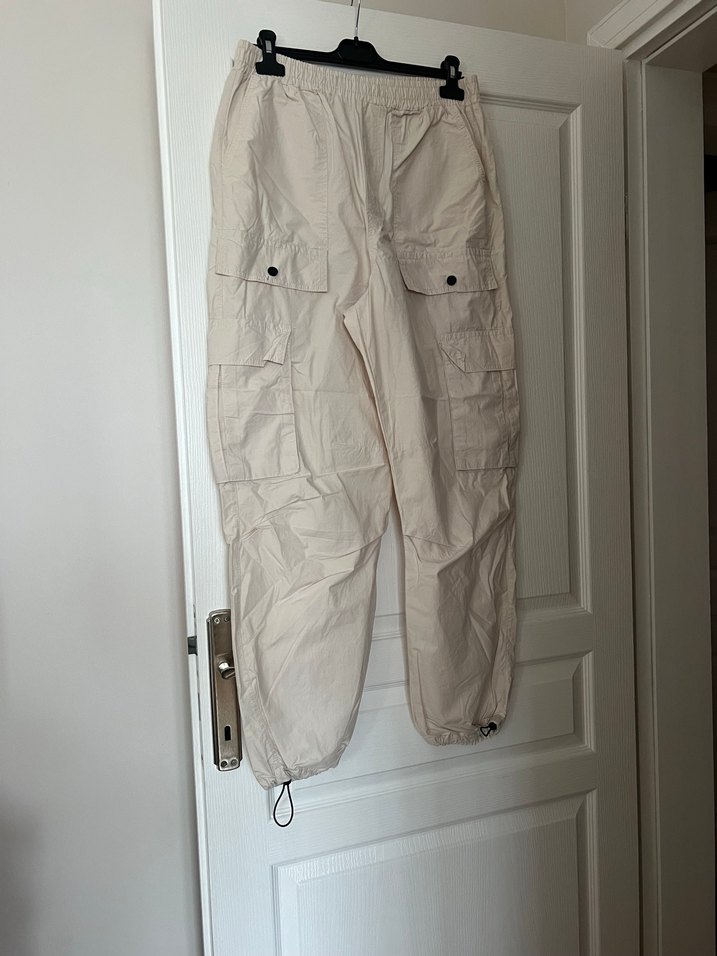 Beli kemerli, bol kesim, keten kumaştan bej renkte kadın pantolon. Midi boy, cep detaylı, rahat ve hafif yapısıyla sokak stiline uygun.