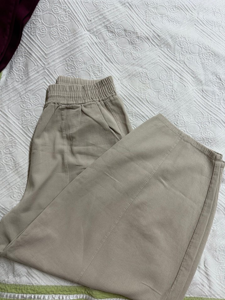 Bol kesim, midi boy, lastikli bel bej keten kadın pantolon, rahat ve şık günlük kullanım için uygundur marka temsili hiç kullanılmadı.