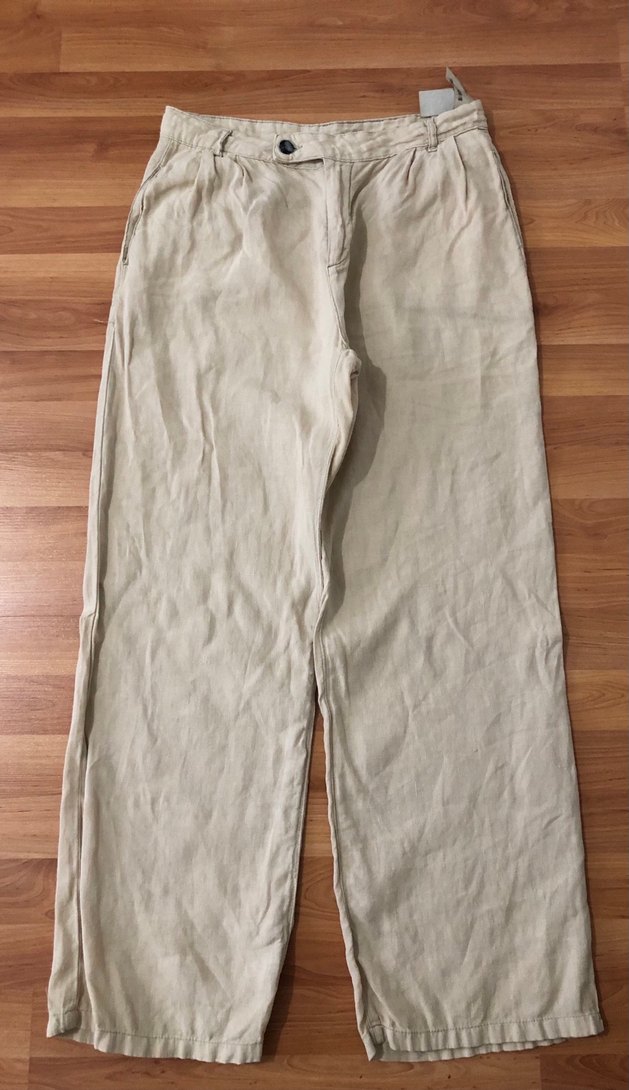 Bej keten pantolon, bol kesim ve midi boyda olup, günlük kullanıma uygun rahat ve sade bir bohem stil sunar. Effortless chic görünümüyle dikkat çeker. Sıfır hiç kullanılmamış üründür. Sadece etiketi eksiktir.