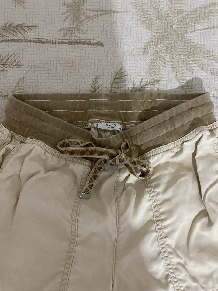 Bej keten kumaştan, bol kesimli ve kemerli, pastel tonlarda, midi boyda kadın Jogger pantolon. Günlük kullanıma uygun.