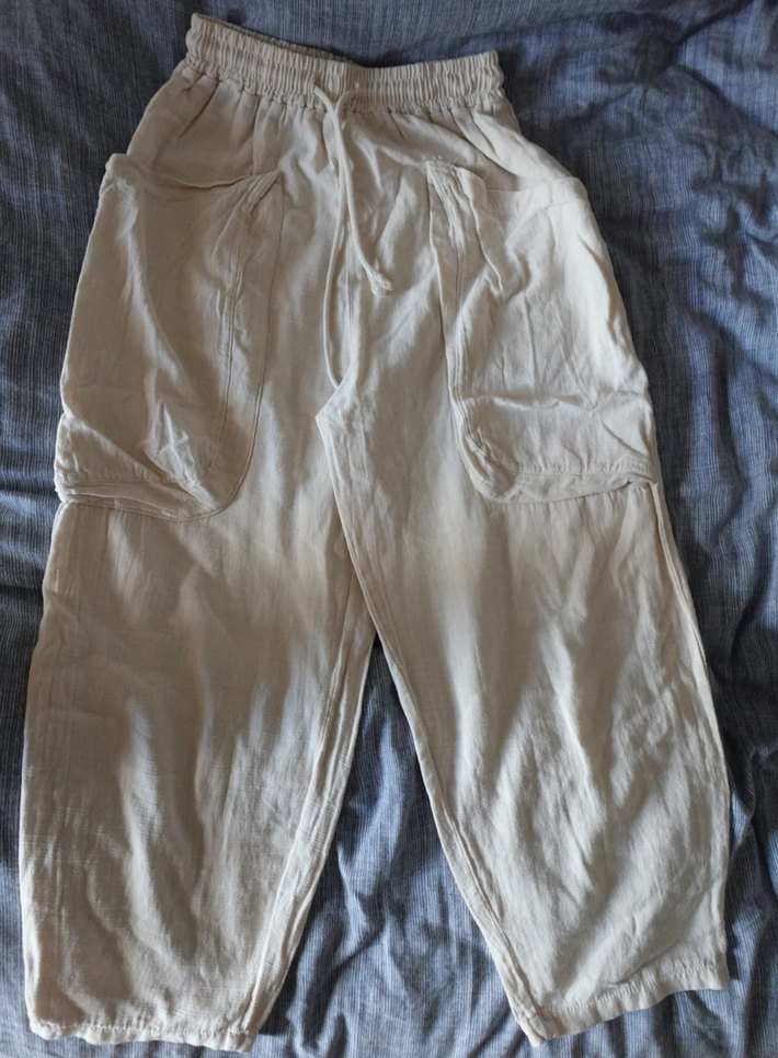 Bol kesim, elastik bel ve ön geniş cepli bej keten pantolon, günlük rahat ve bohem stil sunar.