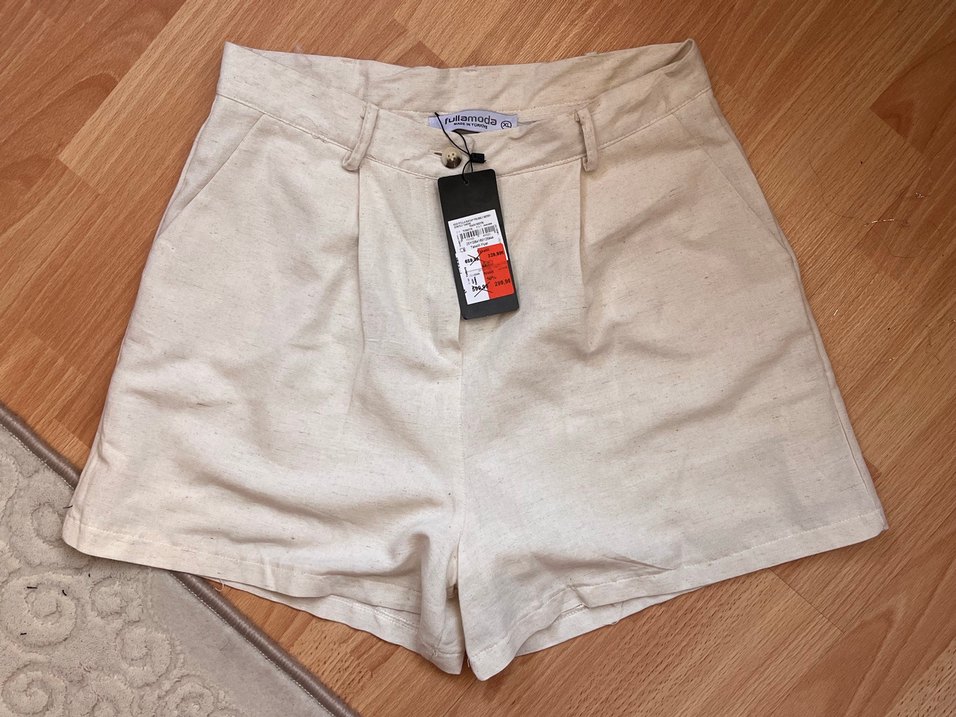 Bej keten kumaştan, bol kesim ve yüksek bel mini şort. Rahat ve sade tasarımıyla gündelik dış mekan kullanımı için uygun. Yeni aldım ama hoşuma gitmedi hiç giymedim öylece duruyor. Astarlı iç göstermiyor çok rahat. alana hayırlı olsun