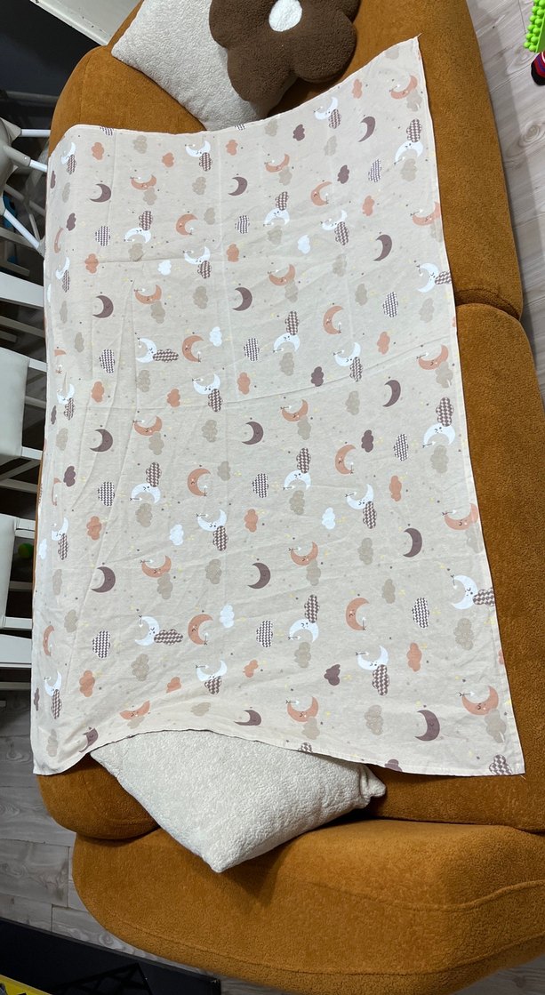 Yumuşak keten kumaştan yapılmış bej çocuk battaniyesi, hafif desenli ve rahat bir dokunuş sunar. Çarşaf