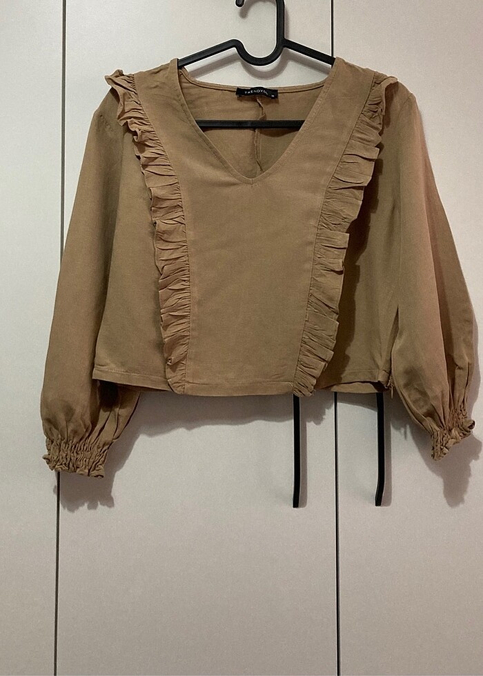 Keten crop. Koyu bej gibi, açık ton camel gibi karar veremedim.. fotoğrafta göründüğü gibi bir rengi var :) Hiç giyilmedi. Ürünün bel uzunluğu ve kol altından bele olan uzunluğu son iki fotoğrafta görünüyor. Yanda bir fermuar detayı var.