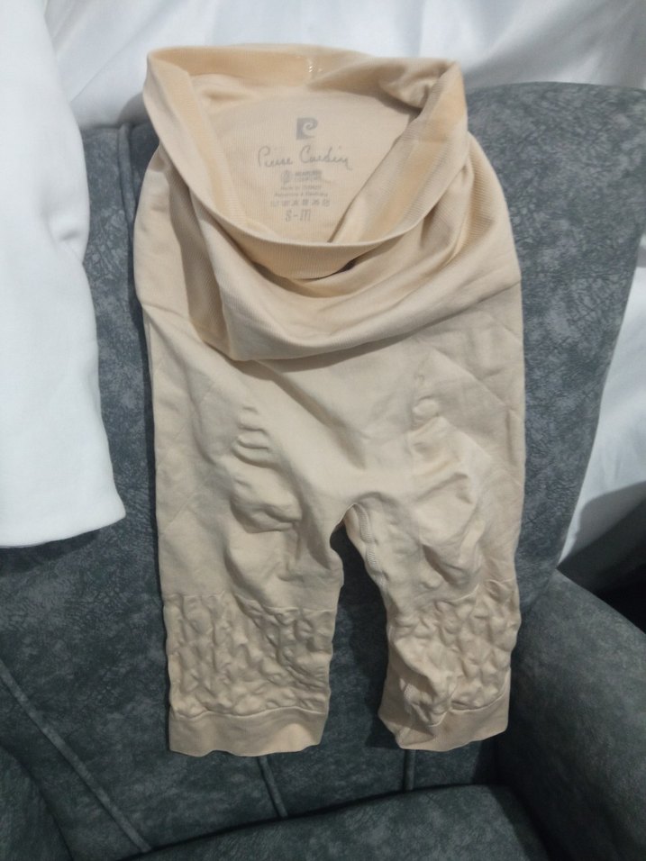 Bej keten kumaştan, drapeli ve vücuda oturan hamile pantolonu, günlük kullanıma uygun rahat ve şık.