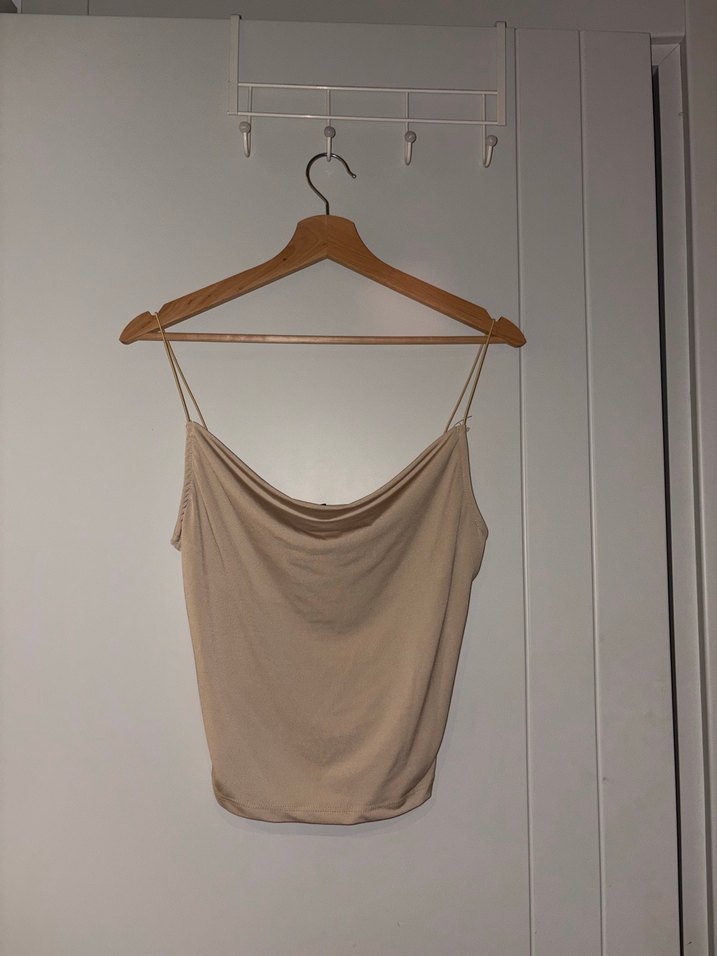 Bej keten kumaştan, düz yakalı, ince askılı ve drapeli detaylı, normal boyda ve vücuda oturan kadın bluz