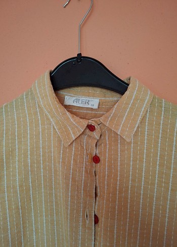 Bej keten kumaştan, düğmeli ve yakalı uzun kollu, bol kesim bohem tarzda kadın gömleği. Pastel tonlarda, günlük kullanım için uygundur. ALER etiketi bulunur.