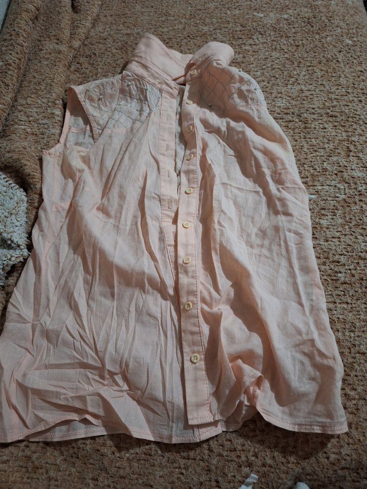 Yumuşak keten kumaştan, düğmeli önü ve yakalı bej renkte, bol kesim kolsuz gömlek. Vintage bohem tarzda, günlük kullanım için uygun.