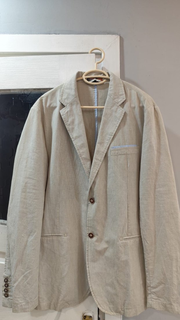 Bej keten, düğmeli notched yaka ve uzun kolludur. Normcore tarzda, ve günlük kullanım için uygundur. Orijinal centone ceket