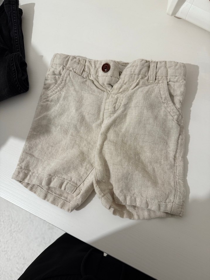 Bej keten kumaştan, düğmeli ve bol kesim erkek şort. Desensiz, sade tasarımıyla bohem tarzına uygun.