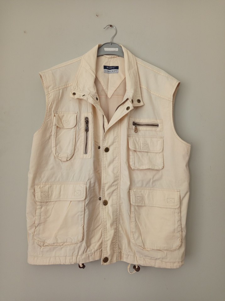 Bej renkte keten kumaştan yapılmış, düğmeli ve çok cepli, yakalı erkek yelek. Rahat kesimi ve normal boyu ile günlük sokak stiline uygun. son iki resimde gösterdim minik leke var onun dışında sorunsuzdur fermuarı çıtçıtları sağlam defo sökük yok üst duruş giyen 85kg dir nostaljik güzel bir erkek yelek bir çok cep mevcuttur ekru renk mevsimliktir marka temsilidir
