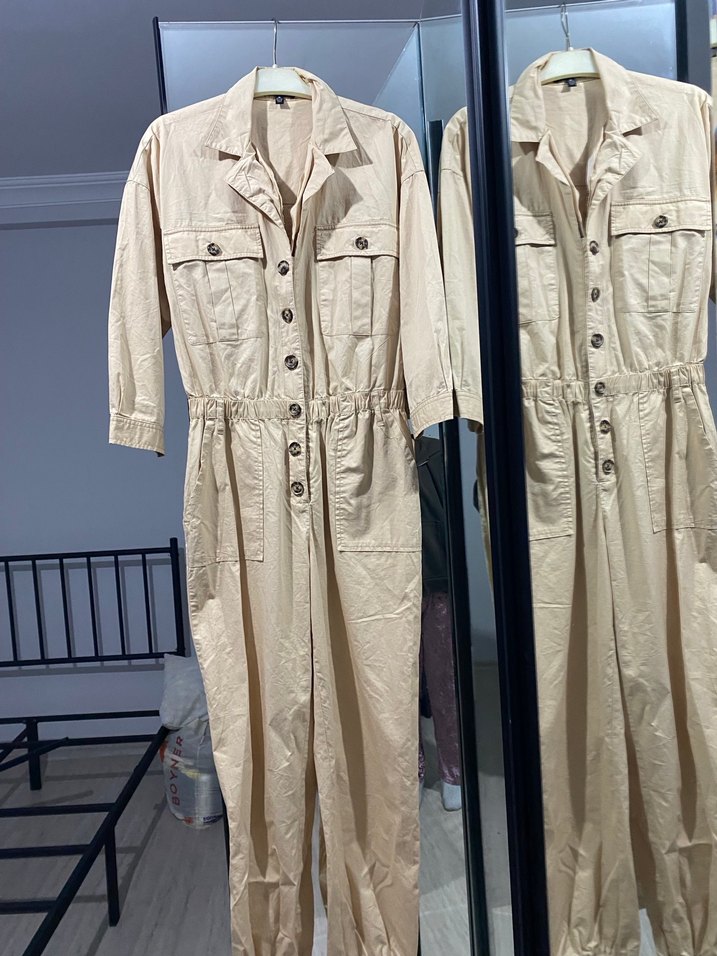 Bej renkte, keten kumaştan yapılmış, düğmeli, gevşek kesim kısa kollu tulum. Notlu yaka ve iki göğüs cebiyle günlük rahat stil sunar.