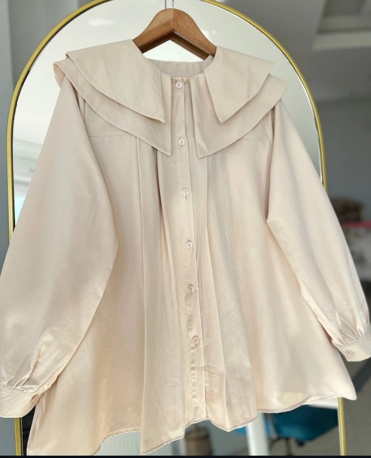Bej keten kumaştan, düğmeli ve yakalı hamile bluzu. Uzun kollu, bol kesim ve midi boyda, bohem tarzda günlük kullanım için uygun.