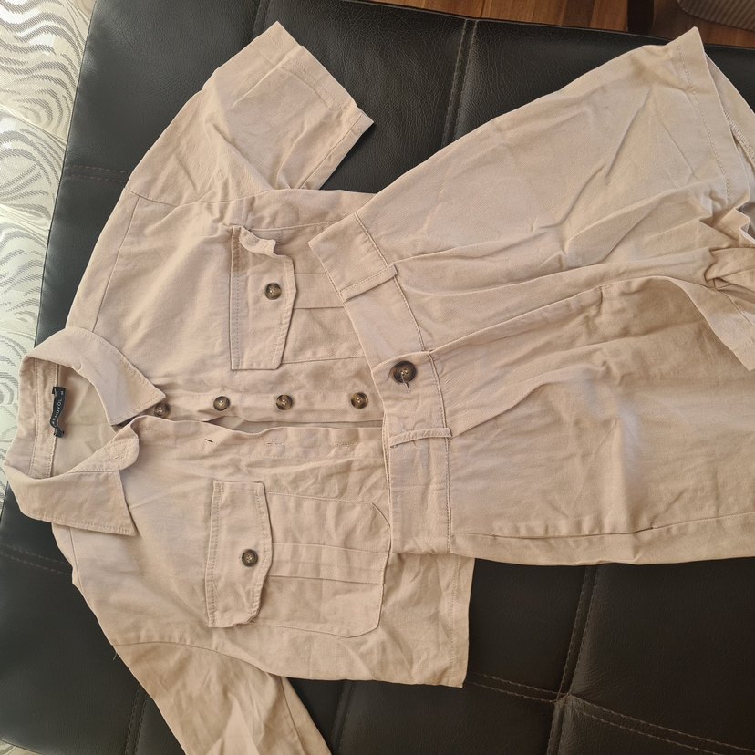 Bej keten kumaştan, kısa kollu, düğmeli takım. Sadece bir kere giyildi, ütüsüz fotoğrafını koymak zorunda kaldım normalde daha güzel duruyor. Üstümde bir fotoğrafını daha ekledim oradan bakabilirsiniz.