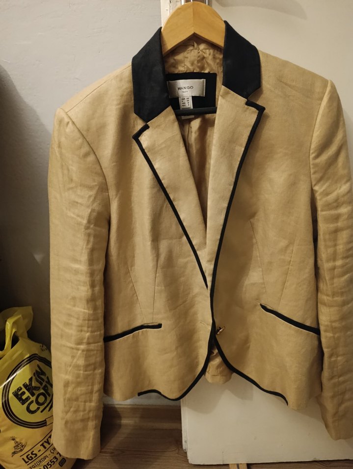 Bej keten kumaştan, düğmeli, uzun kollu kadın blazer. Siyah şerit detayları ve klasik kesimiyle ofis için uygun. M bedene daha uygun L ye dar gelir