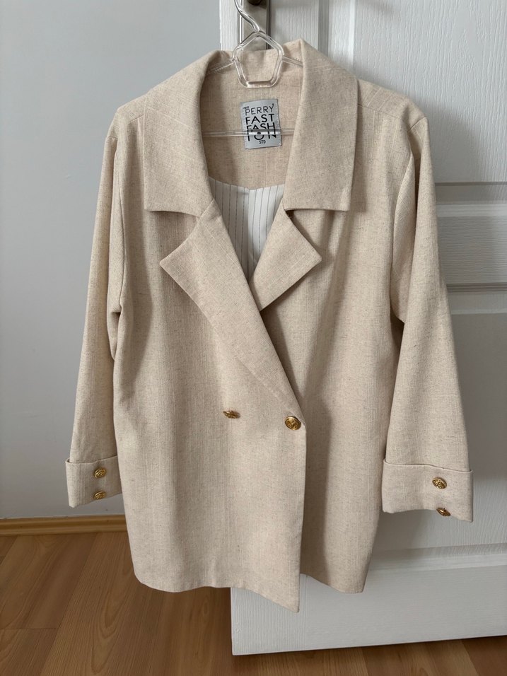 Bej keten kumaştan yapılmış, düğmeli, uzun kollu kadın blazer ceket. Normal kesim ve midi boyda, ofis için uygun, sade ve klasik tarzda.