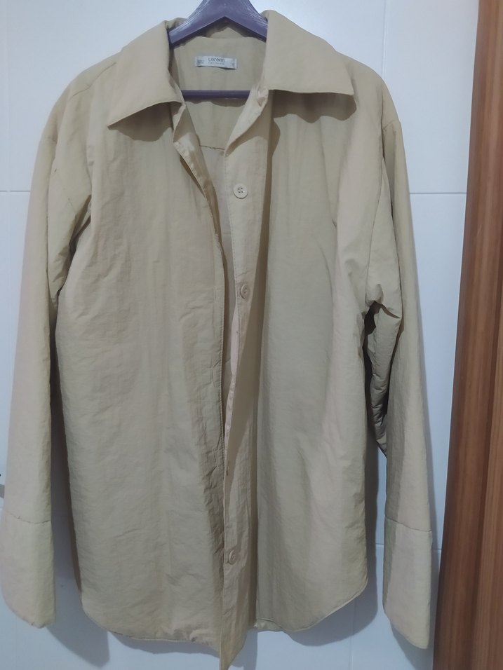 Bej keten kadın gömlek, uzun kollu ve düğmeli. Notlu yaka, midi boy ve normal kesimle minimalist tarzda günlük kullanım için uygun.trnc olarak kullandım.ici astarlı hafif dolgulu.1 beden ama 40 44 46 beden uymlu