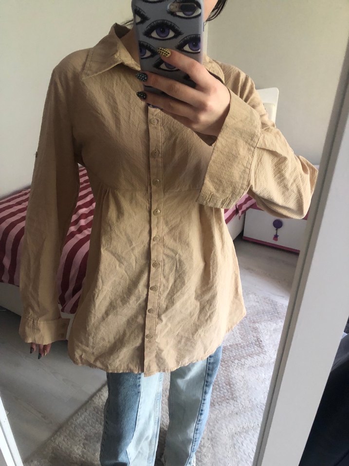 Bej renkli keten kumaştan, düğmeli, uzun kollu, yakalı ve rahat kesim midi uzunluğunda kadın gömleği. Günlük kullanıma uygundur.