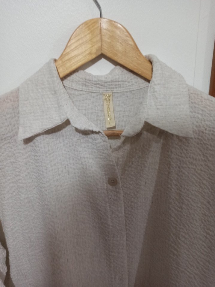 Bej keten gömlek, yakalı ve uzun kollu, düğmeli, bol kesimdir. Desensiz sade tasarımı günlük kullanıma uygundur.