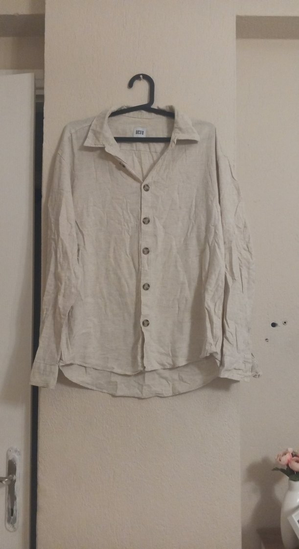 Bej keten kumaştan, uzun kollu, düğmeli kadın gömlek. Notlu yaka ve rahat kesimi ile günlük sokak stiline uygun.iki koltuk arası 53 uzunluk77