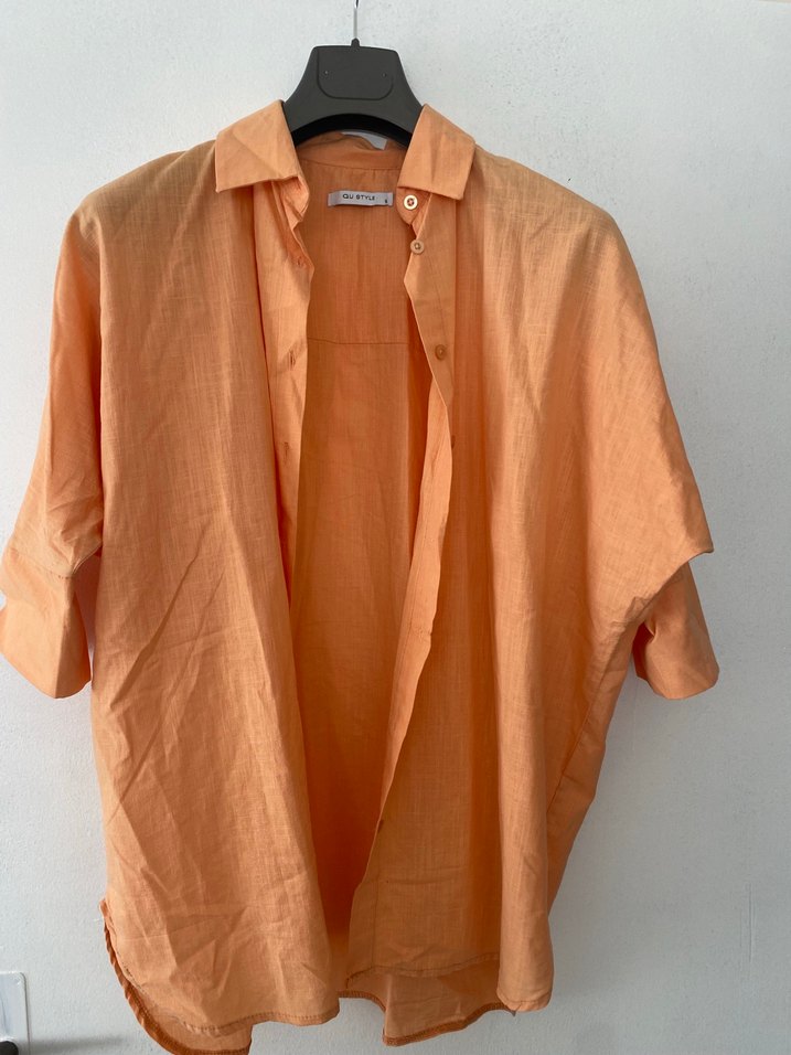 Bej keten kumaştan, düğmeli, kısa kollu, normal midi boyda, bol kesim kadın gömlek. Günlük kullanım için uygundur.