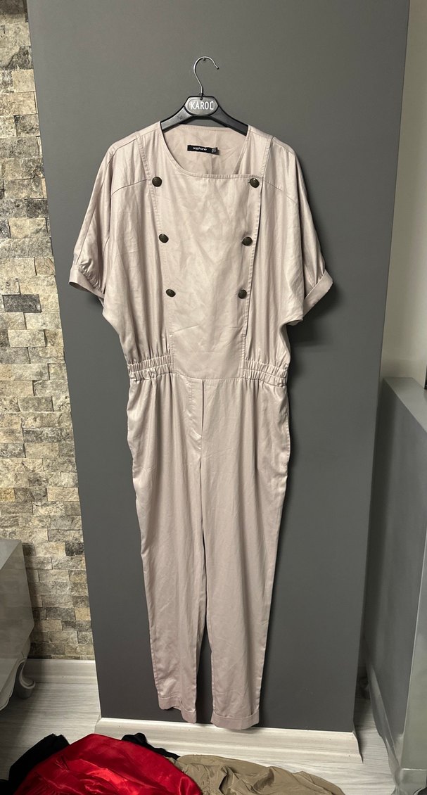 Bej renkte, kumaştan, düğmeli ve kısa kollu kadın tulumu. Salaş kesimi ve yakası notched lapel. Günlük sokak stili için uygun.