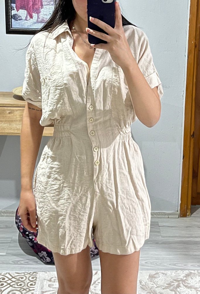 Bej Keten Düğmeli Kadın Tulum