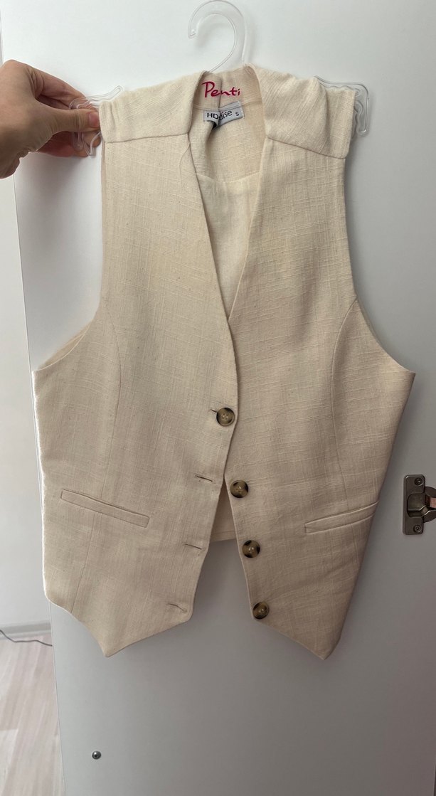 Bej renkte, keten kumaştan, düğmeli, kolsuz ve normal uzunlukta kadın yelek. Uzun kollu bluzların üstünede çok yakışıyor düzenli kesimle tasarlanmıştır.
