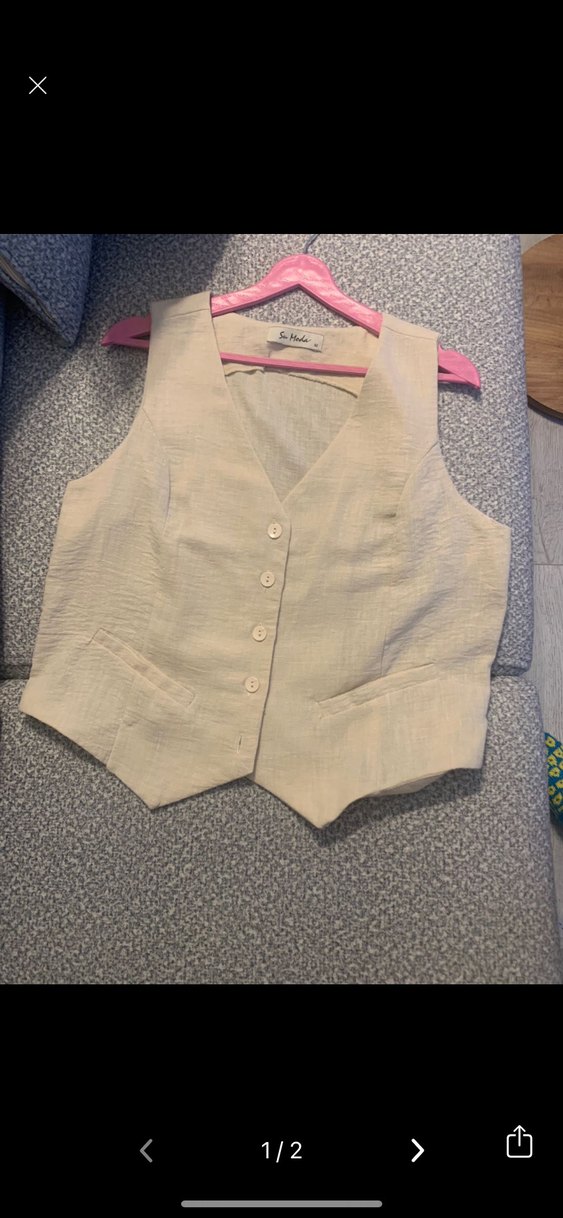 Bej renkte, keten kumaştan yapılmış, düğmeli ve yakalı kolsuz kadın yeleği. Normal uzunlukta ve rahat kesimlidir, ofis için uygundur.