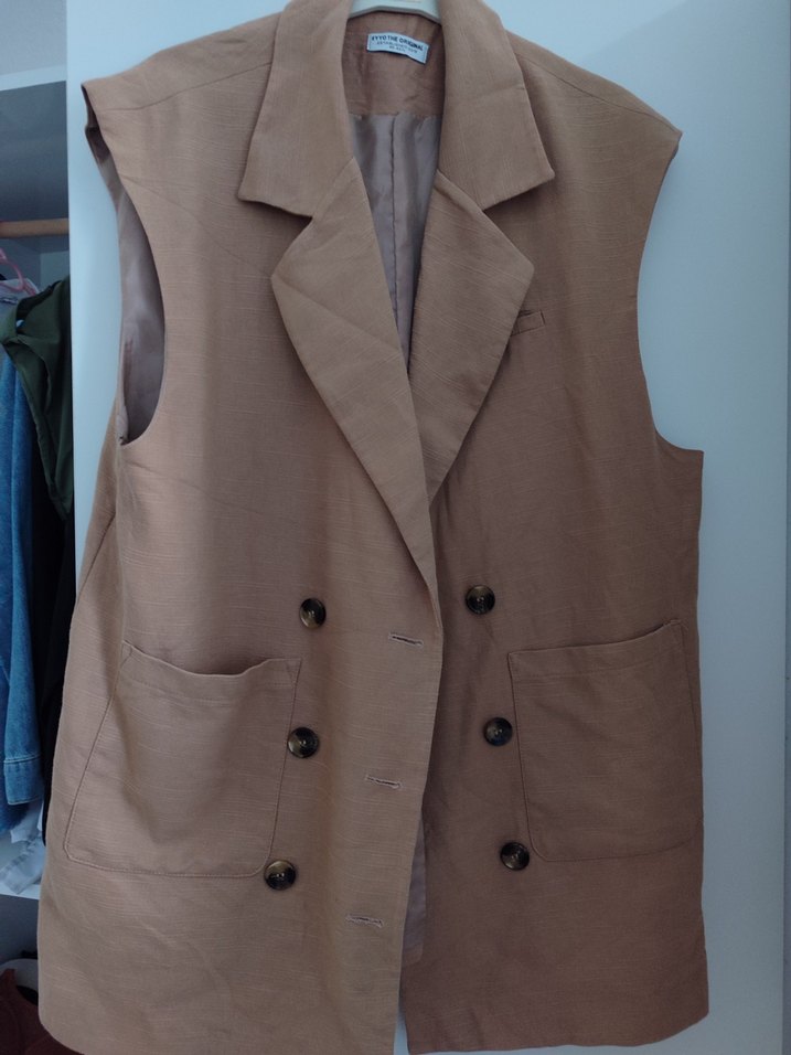 Bej renkte, keten kumaştan, normal boyda ve düğmeli kadın yelek. Yaka kısmı kesik ve ceplidir, rahat kesimiyle günlük sokak stiline uygundur.