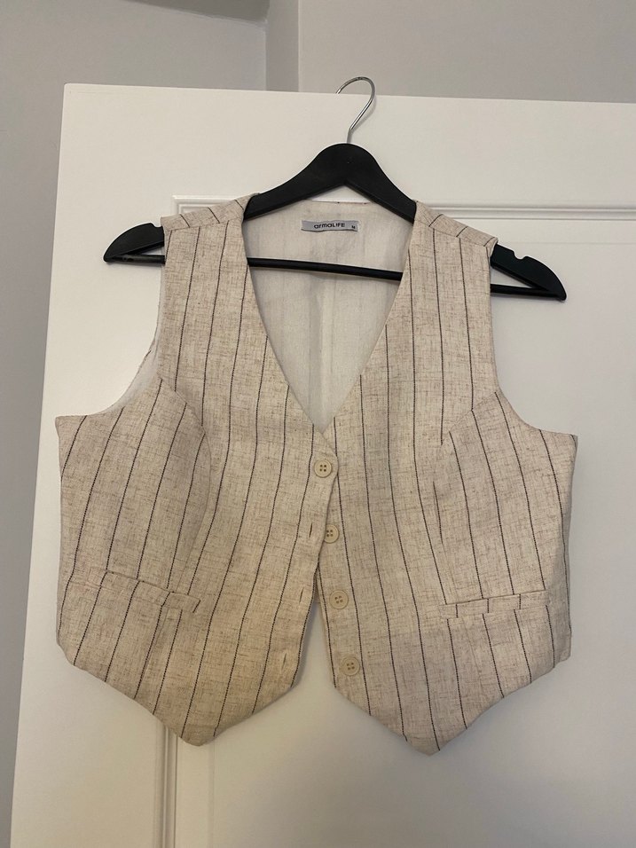 Bej keten kumaştan, düğmeli, kolsuz ve yakalı kadın yeleği. Normal uzunlukta ve rahat kesim, şık bir parça.