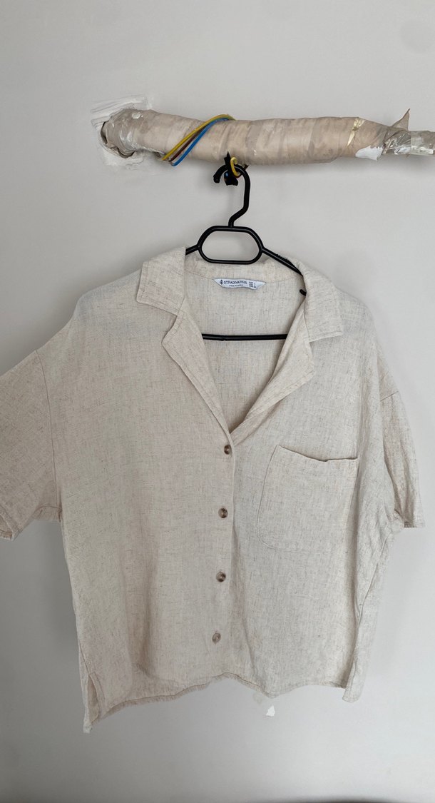 Bej renkli keten kumaştan, düğmeli ve kısa kollu, gömlek yaka, bol kesim gömlek. Göğüs cebine sahip, rahat günlük kullanım için uygun. Neredeyse hiç giymedim. 1 kere giydiğimi hatırlıyorum. Bana yakışmadı.