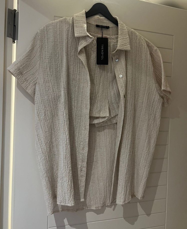 Bej keten kumaştan, düğmeli, kısa kollu ve yakalı, bol kesim gömlek şort takım Günlük kullanıma uygun rahat ve sokak stili görünüme sahiptir.