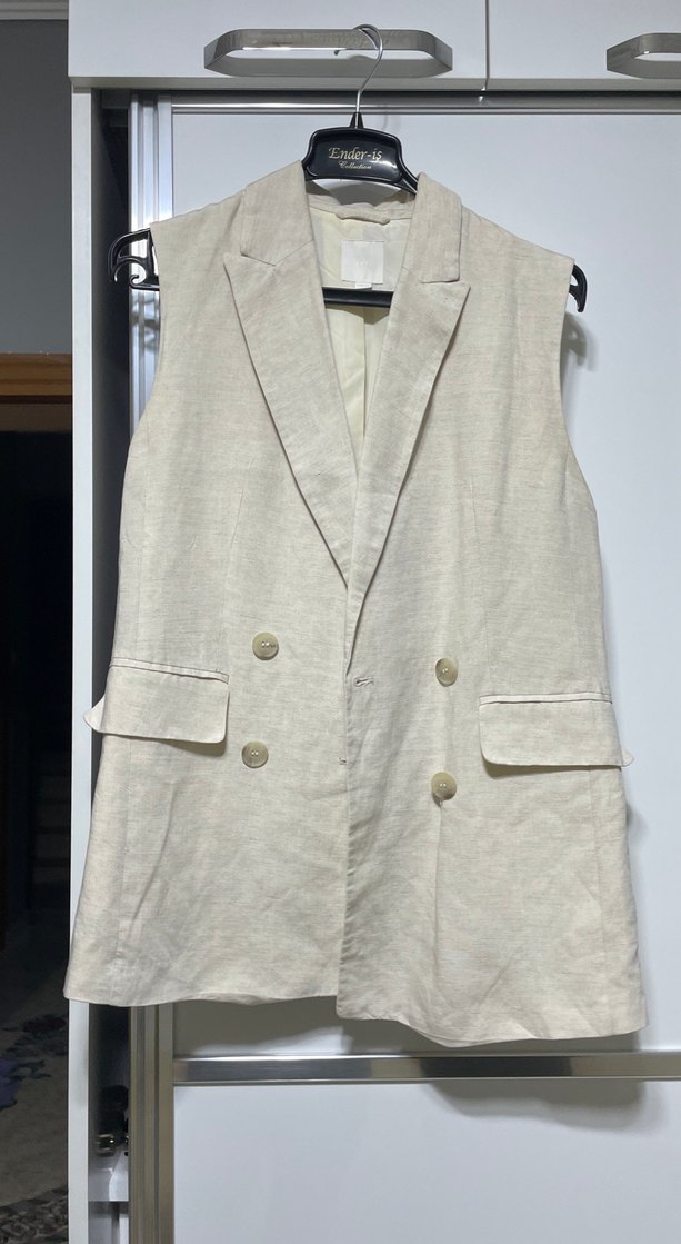Kolsuz, keten kumaştan bej renkli, düğmeli önü ve kesik yaka detaylı kadın blazer. Normal uzunlukta ve rahat kesimlidir. lekesi fotoğrafta belirtildi