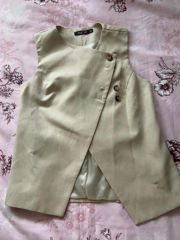 Bej Keten Düğmeli Kolsuz Kadın Yelek