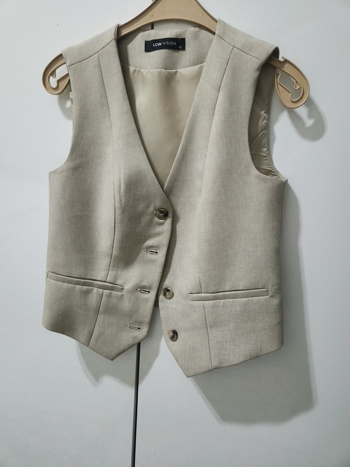 Bej Keten Düğmeli Kolsuz Kadın Yelek