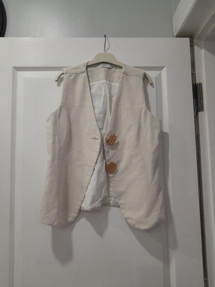 Bej renkli, keten kumaştan yapılmış, kolsuz, düğmeli ve kesimli yakalı yelek. Rahat kesimi ve kısa boyuyla günlük şıklığa uygun bohem tarz.