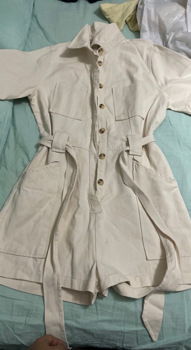 Bej Keten Düğmeli Midi Tulum