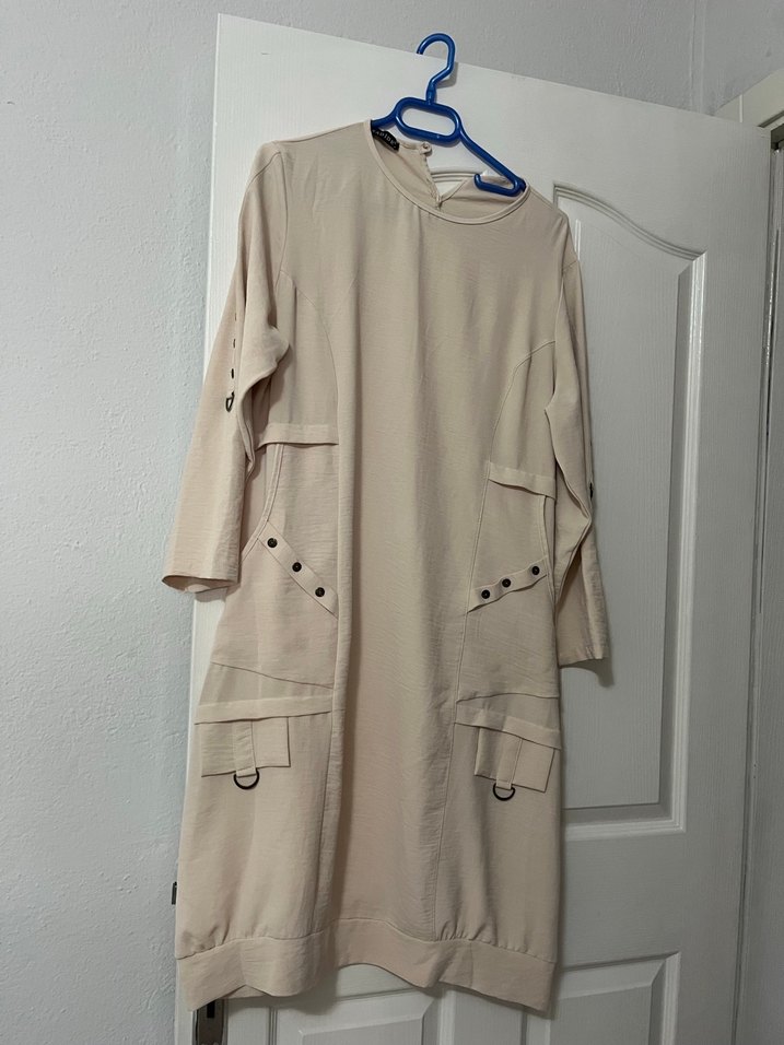 Bej keten kumaştan, düğmeli ve cepli, uzun kollu, salaş kesim midi tunik. Günlük rahat kullanım için uygundur.