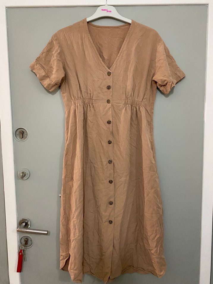 Bej keten kumaştan, düğmeli, kısa kollu, V yakalı, bol kesim uzun elbise. Minimalist bohem tarzıyla rahat bir görünüme sahiptir.