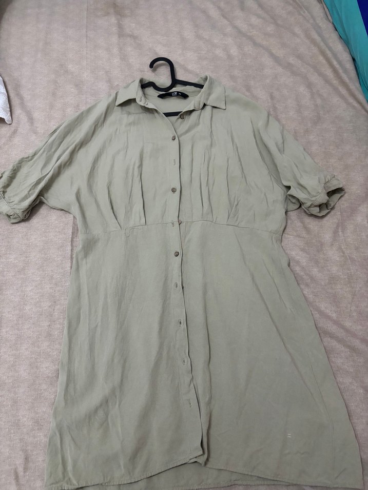 Bej keten kumaştan, uzun, bol kesim, kısa kollu, yakalı ve düğmeli kadın elbisesi, günlük sokak stili için uygundur.