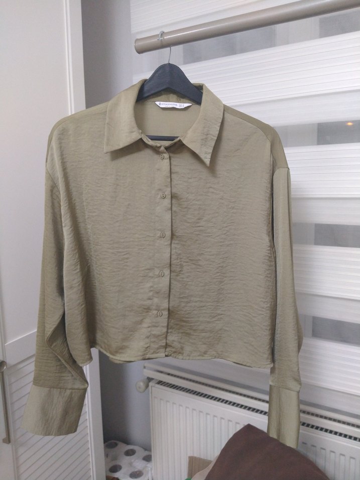 Düğmeli, uzun kollu, bej keten gömlek. Salaş kesimi ve yakalı tasarımıyla günlük kullanıma uygundur.