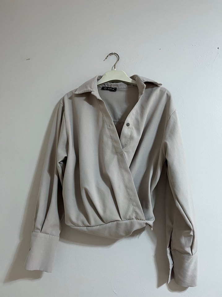 Bej renkli keten, düğmeli, yakalı uzun kollu ve kısa kesim gömlek. Rahat kesimiyle gündelik sokak stiline uygundur.