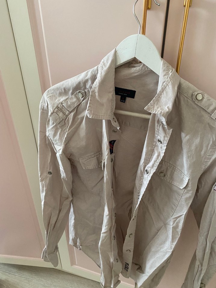Bej keten kumaştan, düğmeli, uzun kollu, yakalı ve bol kesim gömlek. Normal midi boyda, günlük sokak stili için uygundur.