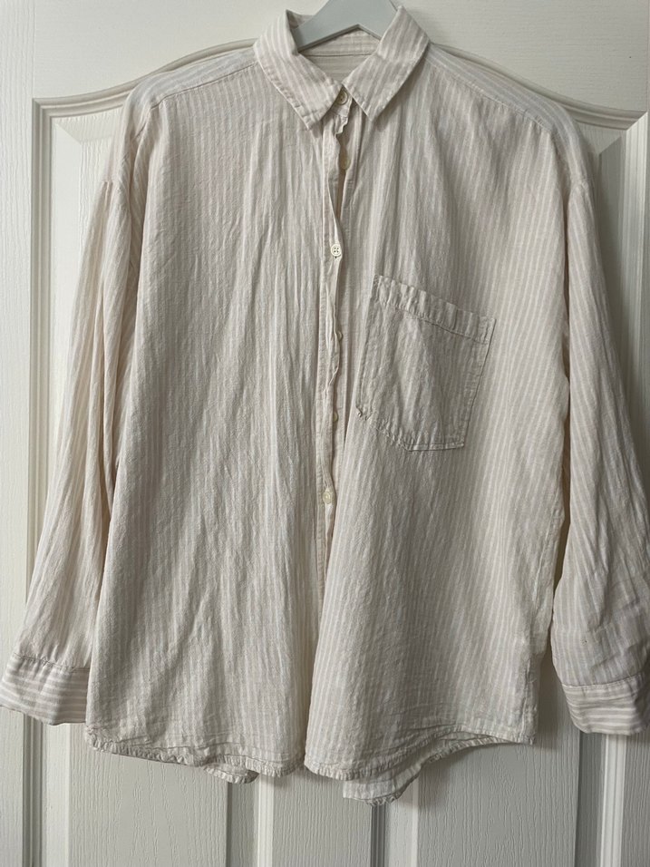 Bej keten gömlek, uzun kollu ve düğmeli. Salaş kesimi, yakalı ve göğüs cebine sahip, bohem tarzda rahat bir parça.
