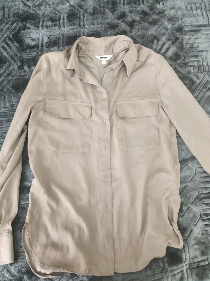 Bej keten kumaştan, uzun kollu ve düğmeli, yakalı, bol kesim kadın gömleği. Günlük rahat kullanım için uygun midi boyda.