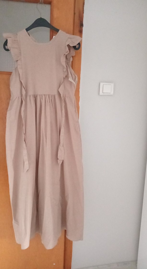 Keten kumaştan, askısız, bol kesim, bej renkli uzun hamile elbisesi, fırfır detaylı ve minimal tarzda günlük kullanım için uygun. beyaz gömleğin koltuk altlarında ve yakasında küçük bi nokta var yikanirsa geçebilir başka elbisenin hiç bir deposu yok kendi beyaz gömlekle beraber gelicektir