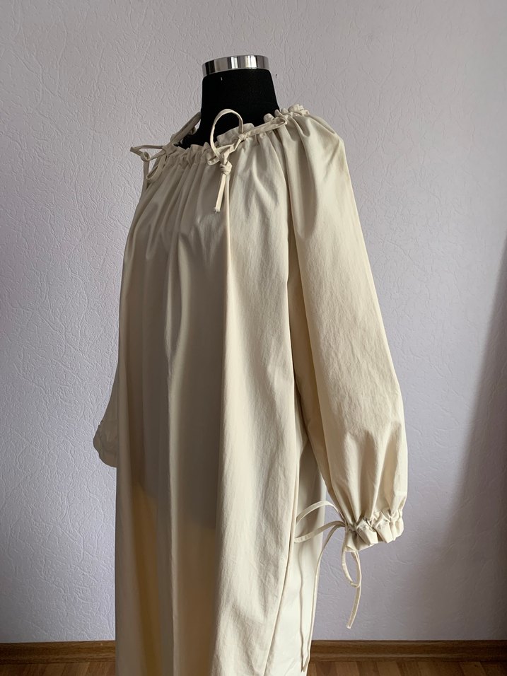 Bir eşi daha yok. Pamuk kumaş, özel tasarım rahat ve şık bir elbise omuz ve kolları büzgülü, farklı tarzlarda kullanılabilir, büyük cepli M/L beden
