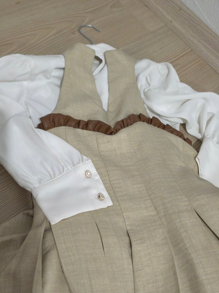 Bej keten kumaştan, ebise gömlek . Gömleğin kafa tarafı biraz zor giriyor fiyata dahil değil ama ürünün içinde altına overlok geçilmemiş